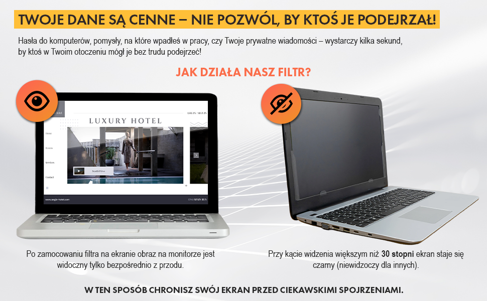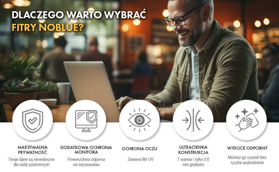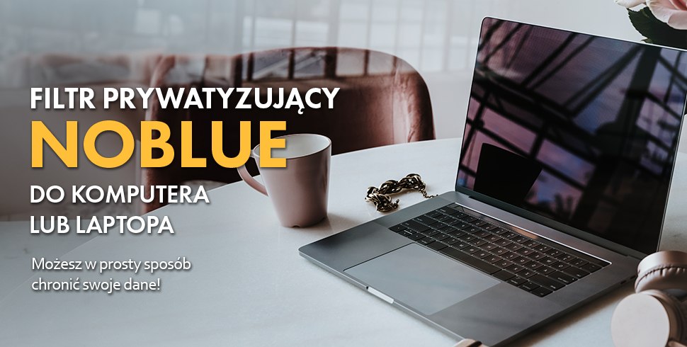 Filtr prywatyzujący NoBlue to Twój codzienny komfort i bezpieczeństwo pracy. Zabezpiecza przed niechcianymi spojrzeniami, chroni dane zgodnie z RODO i dodatkowo blokuje szkodliwe światło UV.